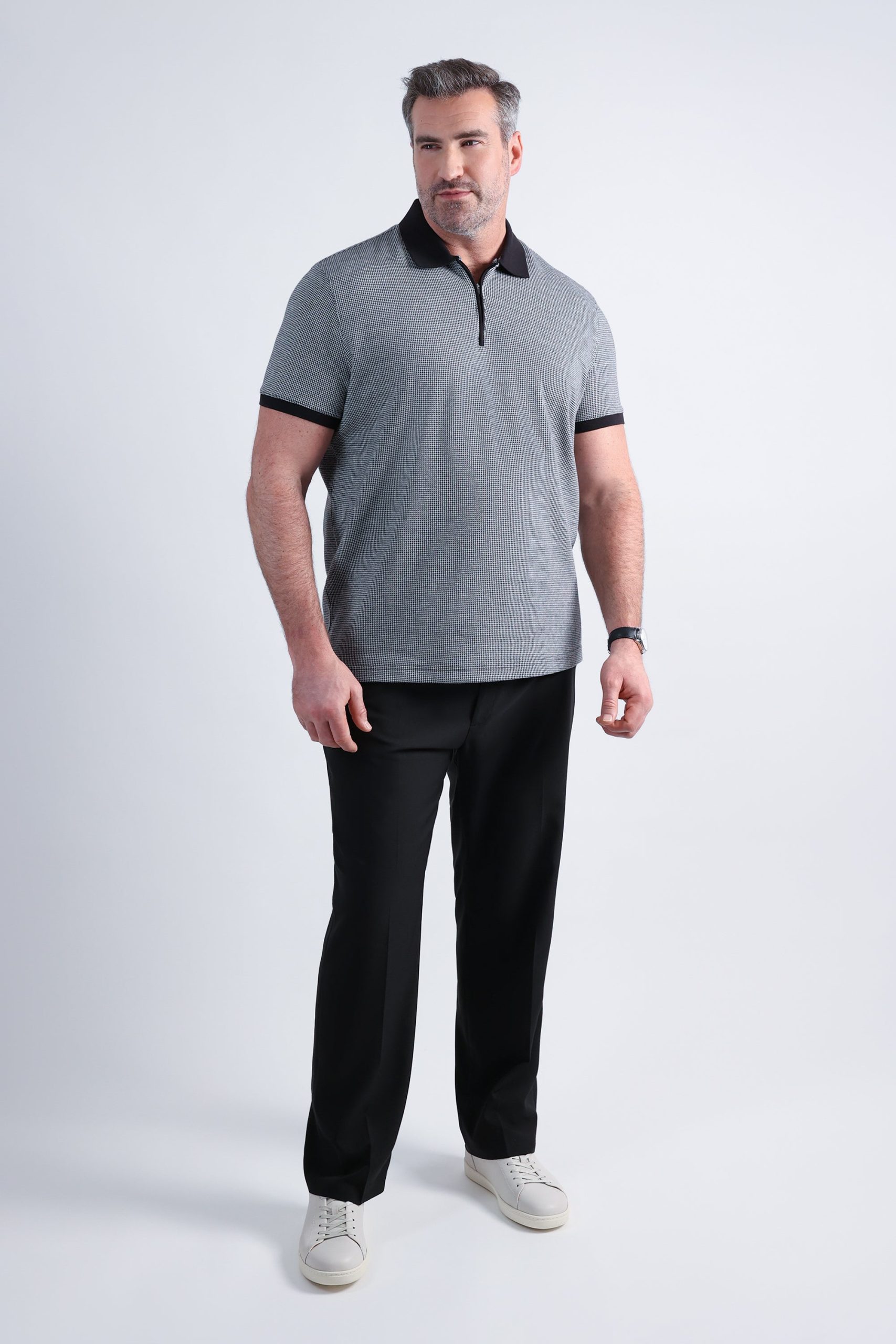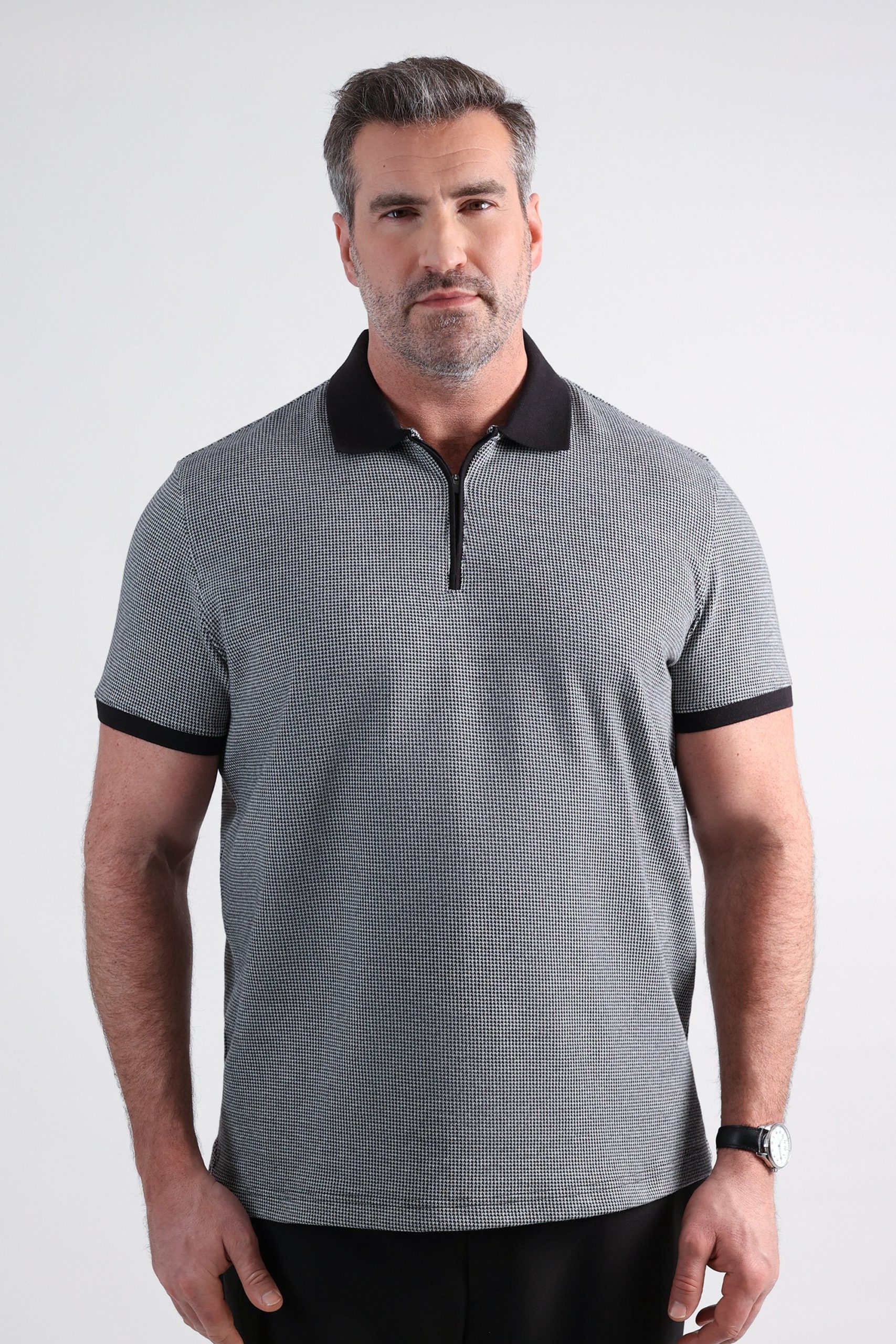 Upgrade your casual wardrobe with the Haggar® Men’s Premium Comfort Quarter Zip Houndstooth Polo, combining classic style with modern comfort. Made from a blend of cotton and polyester, this short-sleeve polo features a subtle houndstooth pattern and a quarter-zip design for a sleek, polished look. With ribbed details, side vents, and a regular fit, it’s the perfect choice for versatile, everyday wear.