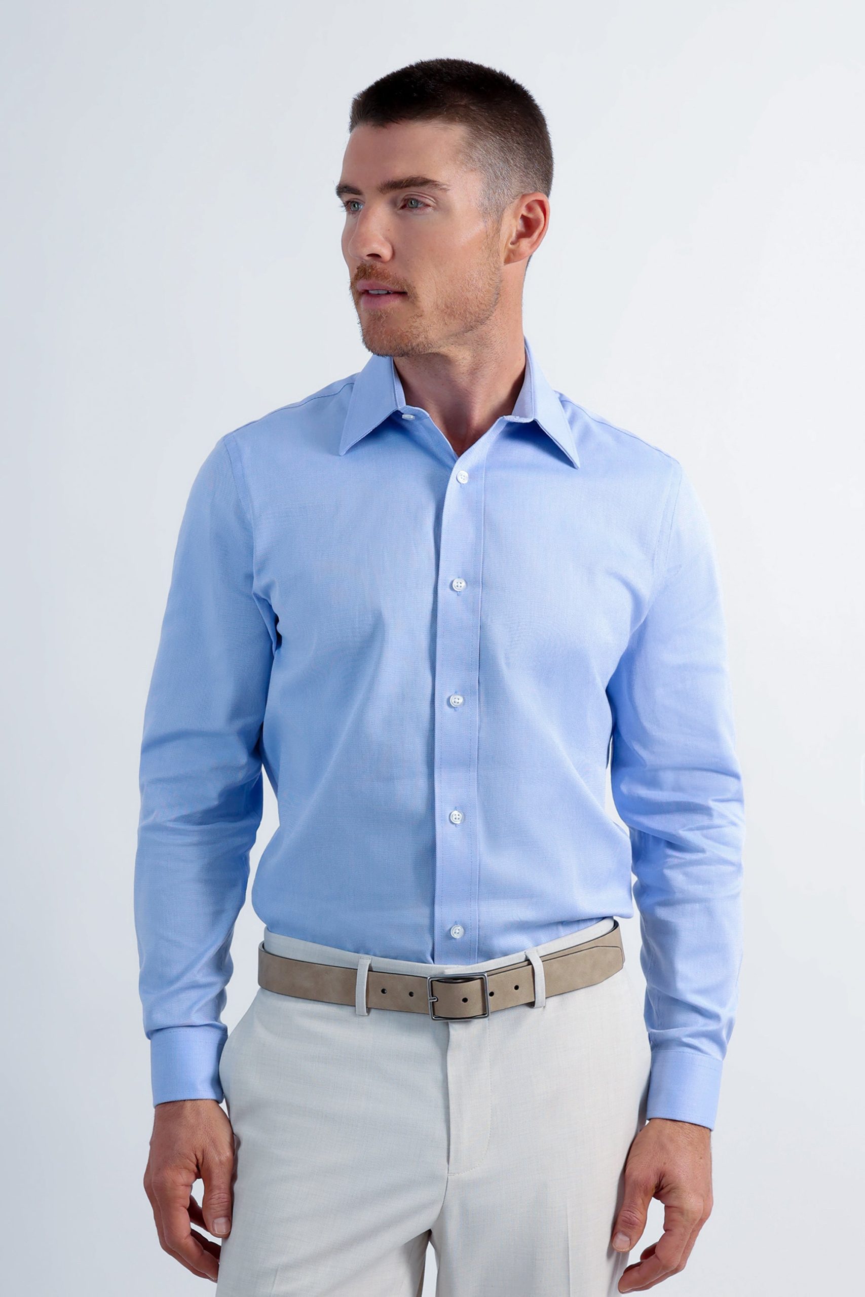 The Premium Comfort Dress Shirt combines modern style with all-day ease in a sleek slim fit. Designed with long sleeves, a pieced placket, and a sharp point collar, it offers a tailored and polished look. Made from wrinkle-resistant fabric with removable collar stays and adjustable button cuffs, this shirt ensures effortless sophistication and comfort.