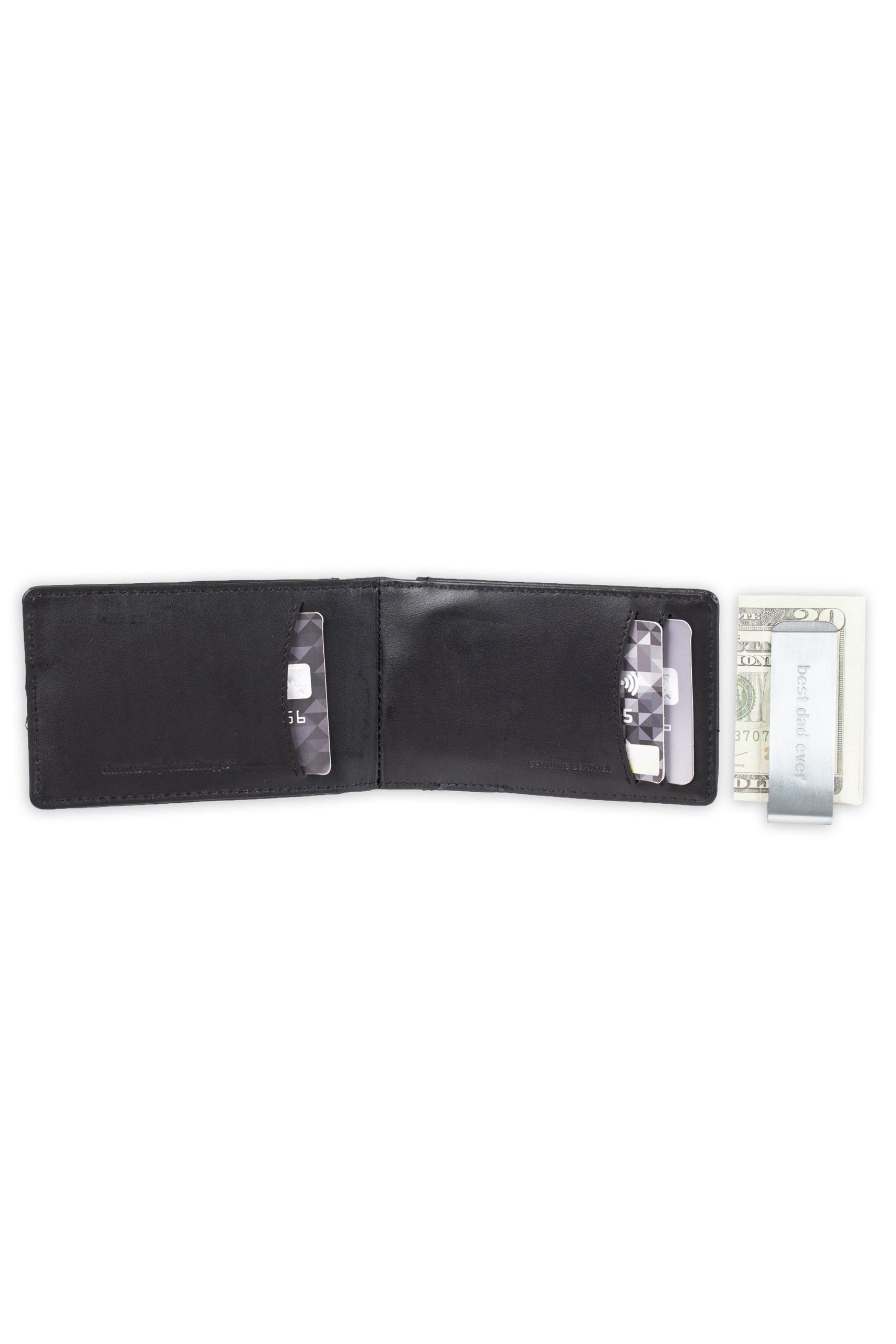 Streamlined for optimal capacity, the bifold wallet organizes your essentials into two sections. Plus a “Best Dad Ever” engraved removable money clip gives an additional carrying solution.