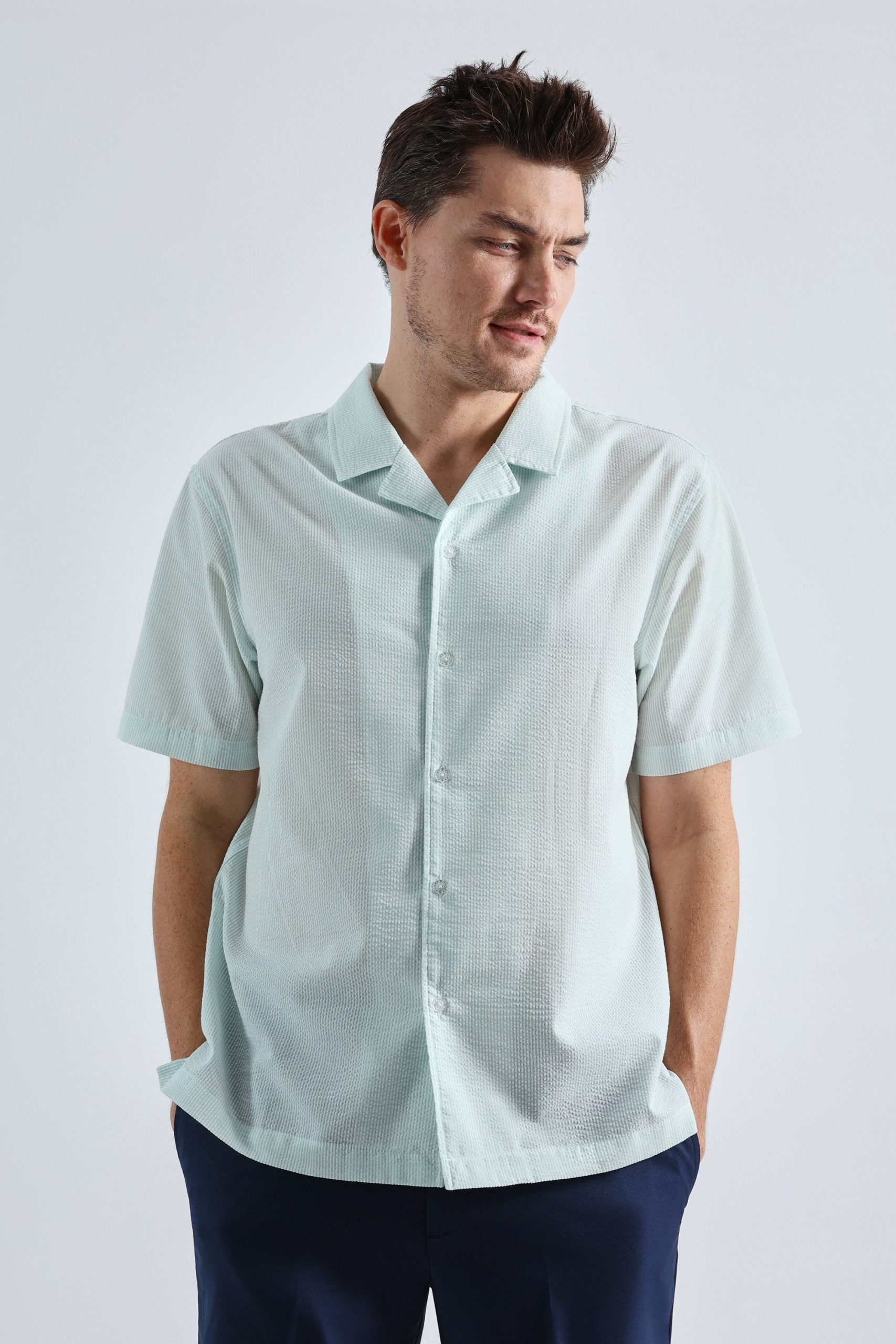 Stay cool and stylish with the Haggar® Men’s Short Sleeve Seersucker Camp Shirt, the perfect blend of laid-back comfort and modern design. Crafted from a lightweight seersucker blend of 65% polyester and 35% cotton, this shirt features a classic camp collar and straight hem for a relaxed yet polished look. Its 5-button front, side vents, and breathable fabric make it an ideal choice for warm-weather occasions or casual outings.