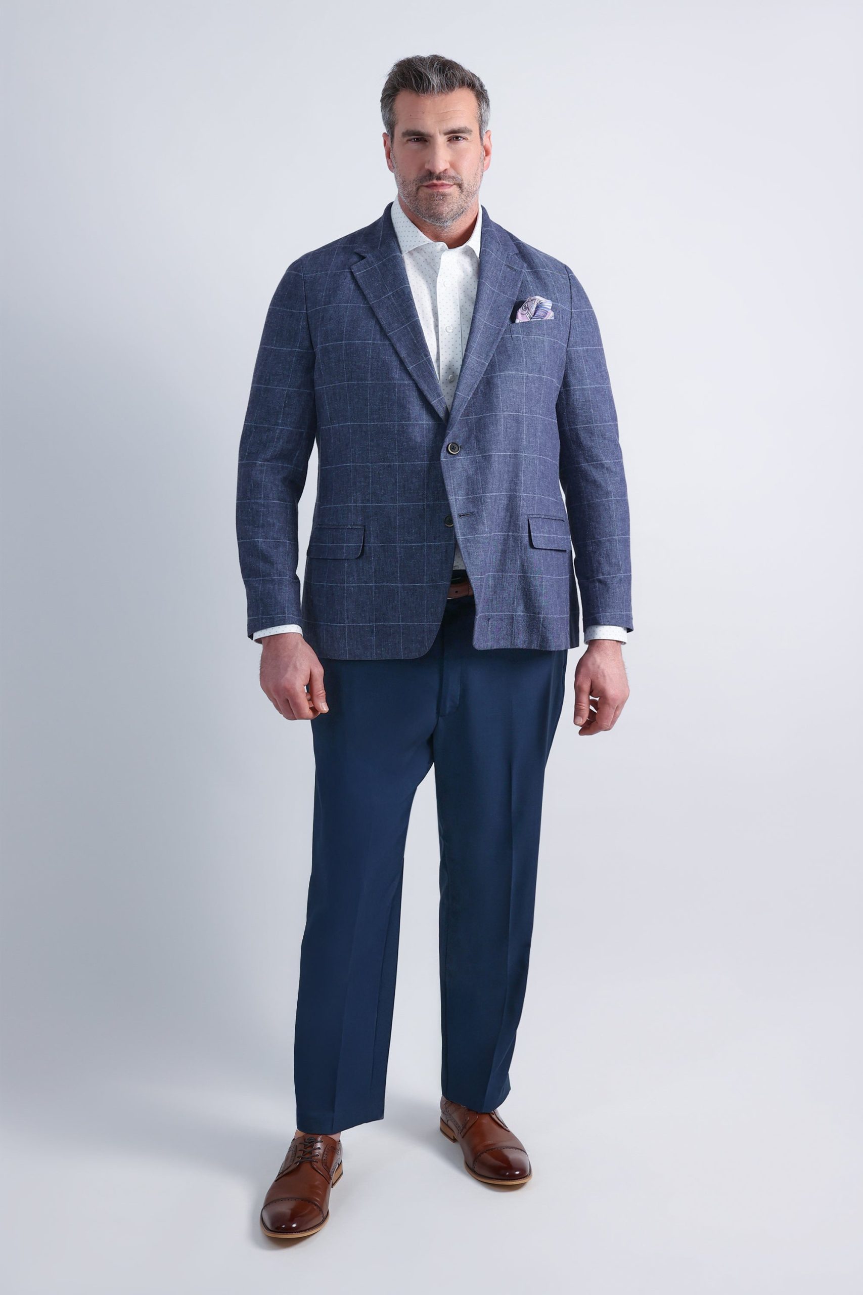 The Big & Tall J.M. Haggar Plaid Windowpane Linen Tailored Fit Sport Coat combines timeless craftsmanship with a modern edge, perfect for the distinguished gentleman. Made from a breathable blend of 55% linen and 45% cotton, this coat offers lightweight comfort and natural sophistication. The tailored fit, chambray windowpane pattern, and refined details like a notched lapel and 2-button front make it an essential for any occasion.